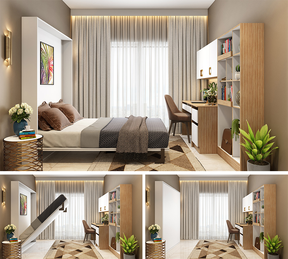 دفتر کار یا اتاق بازی کودکان خود را به راحتی به اتاق خواب مهمان تبدیل کنید. چگونه؟ با این مدل تخت خواب دیواری میتوانید این کار را انجام دهید. همانطور که در تصویر بالا نیز مشخص است در اتاق کار یا بازی کودکان فضای بسیار خوبی وجود دارد که هرگونه جلسه کاری یا بازی کودکانه شلوغی را میتوان داخل آن انجام داد. حال وقتی که زمان استراحت فرا میرسد، با یه تکان ساده و بازکردن تخت همه چیز برای یک خواب آرام و استراحتی دلنشین آماده است.
