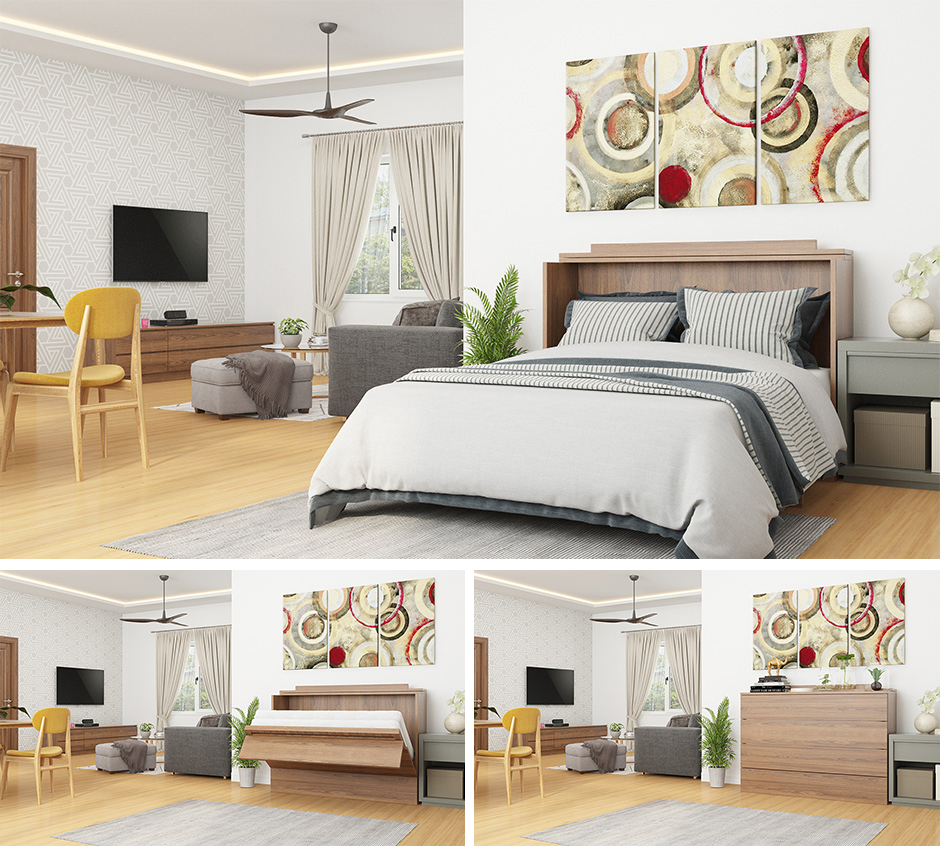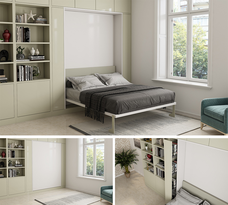 اگر شما از آن دسته از کسانی هستید که مهمانهای فراوانی دارید و مشکل جای مناسب برای استراحت آنها را دارید، ما این تخت خواب دیواری را به شما پیشنهاد میدهیم، این تخت خواب در هنگام جمع شدن تبدیل به یک صندوقچه کوچک در کنار اتاق میشود که وجودش چندان حس نمیشود و فضای زیادی را اشغال نمیکند بعلاوه اینکه از سطح بالای آن میتوان بعنوان دکور استفاده کرد و وسایل تزیینی را روی آن قرار داد.