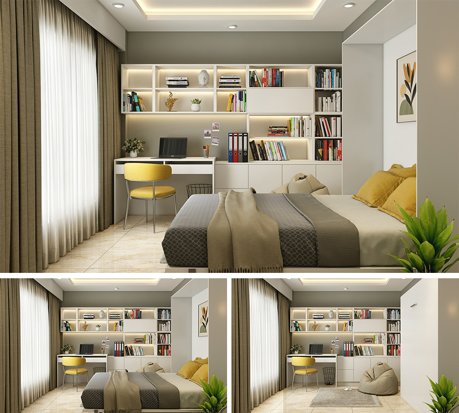 این طرح ساده و زیبا یکی ار رایجترین سرویس خواب های کمجا یا تاشو است. یک تخت خواب دونفره که وقتی باز میشود، تقریبا تمام فضای اتاق را در بر میگیرد و در عوض بعد از جمع کردن آن فضا کاملا باز است بطوریکه انگار در اتاق هیچ تختخوابی وجود ندارد و همچنین کتابخانه روبری تخت که فضای بسیار مناسبی را برای نگهداری وسایل و قراردادن کتابهای مورد علاقه جهت دسترسی، بسیار مفید خواهد بود. در کنار آن یک میز تحریر جهت مطالعه و نوشتن یادداشتهای روزانه بهمراه کمد و کشوهایی که برای قرار دادن لوازم مورد نیاز آن خیلی خوب و دقیق چیده شده است.